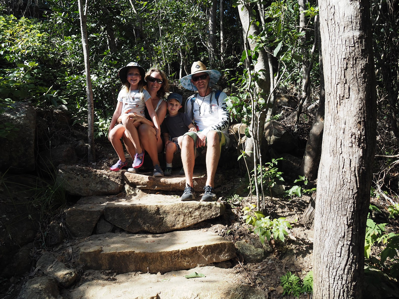 Taking advantage of mum and dad being with us Peter and I used the onboard baby sitting service to climb Whitsunday Peak. The guide book said a steep, 4 hour walk requiring a high fitness level. So we packed a water bag and some food and took mum, dad and the kids to the beach whilst we walked the the peak. The trail has been painstakingly created with huge rock stepping stones. It was steep but well maintained. There were 2 small creek crossings, quite a few butterflies and within the hour we were at the top. It was a windy day but that didn't spoil the amazing view and we sat back at the top and took it all in. It certainly wasn't a 4 hour walk for us but much too far for our kids to walk so we were grateful to get the opportunity to climb it. Mum, dad and the kids had enjoyed their morning on the beach playing boules and soccer and we all headed back to the yacht for lunch.